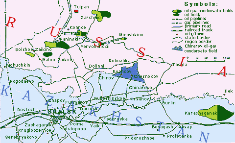 Seventy five kilometers to the south-east, Karachaganak field with unique oil-gas condensate reserves is currently being developed, with growing extractive, processing and transport infrastructure.
