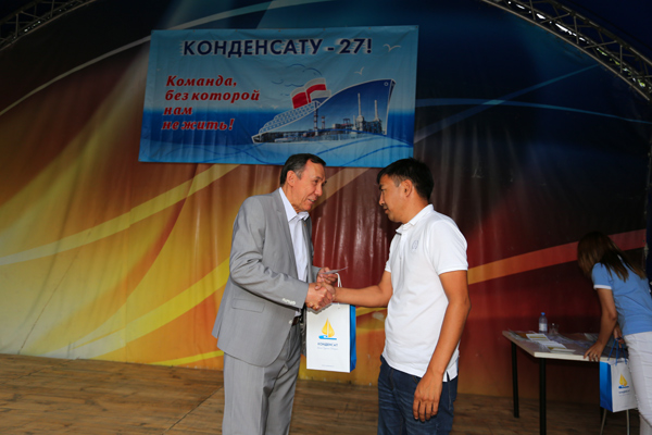 Председатель Совета ГК ''Конденсат'' В.К.Джунусов вручает Памятный знак ''Конденсат'' III степени автокрановщику АО ''АГПЭ'' С.У.Баймагамбетову. День Конденсата, июнь 2019 г.