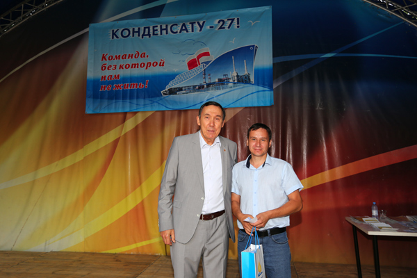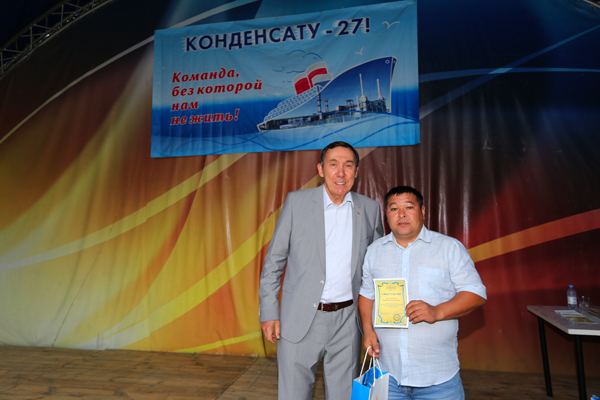 Председатель Совета ГК ''Конденсат'' В.К.Джунусов вручает Памятный знак ''Конденсат'' III степени начальнику производственно-диспетчерской службы АО ''АГПЭ'' А.А.Антонову. День Конденсата, июнь 2019 г.
