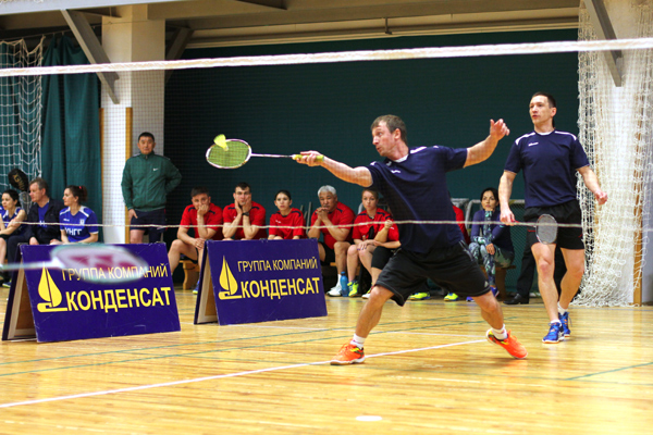 Соревнования по бадминтону в парном разряде из программы XVIII спартакиадф ''Здоровье''. В игре пара Д.Рублев/Р.Мокшин. Апрель 2018 г.