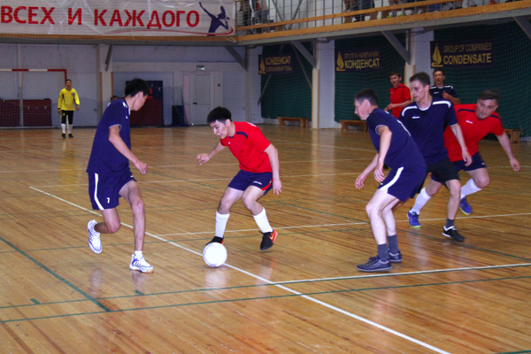 Соревнования по мини-футболу из программы XVIII спартакиады ''Здоровье''. На поле команда ''Нафта'' (темно-синяя форма). Июнь 2018 г.