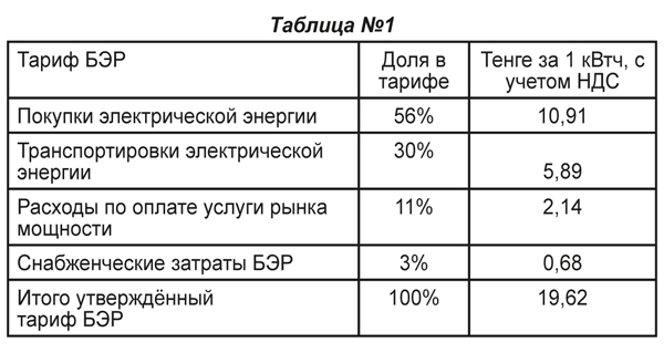 - Действующий тариф энергоснабжающей организации, гарантирующего поставщика электрической энергии ТОО «БЭР» состоит из четырх элементов. Мы подготовили таблицу, где наглядно все показали (см. таблицу №1 – ред.).