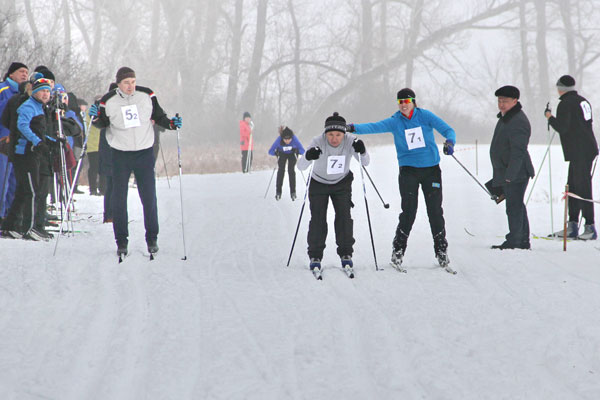После команды судьи «Старт!» по восьми накатанным лыжням отправились в путь женщины-лыжницы, участницы первого этапа. Вперед вырвались несколько более опытных участниц. Дальше гонка шла в две лыжни, по которым быстрее других к финишу этапа добралась первая тройка, представлявшая команды «Энергетик-Уральск», «Энергетик-Аксай» и «Интек-ОНМР». В такой последовательности спортсмены-ветераны ушли на второй круг.