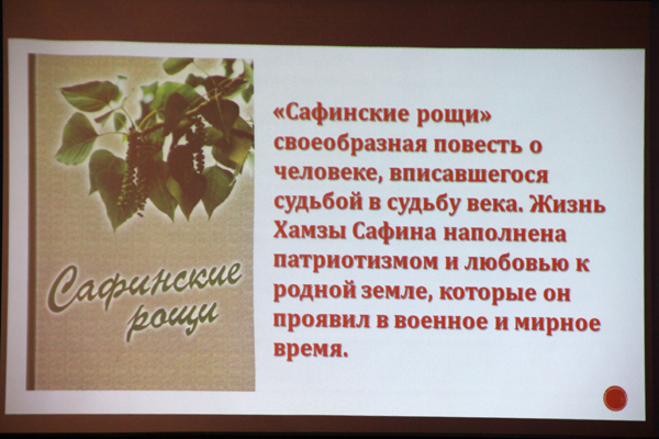 Вышла в свет книга Тамары ШАБАРЕНИНОЙ «Сафинские рощи», рассказывающая о судьбе участника Великой Отечественной войны, Почетного гражданина Уральска, Заслуженного строителя Казахстана Хамзы Абдрахмановича САФИНА. Ее презентация состоялась вчера в областной филармонии им. Г. Курмангалиева.