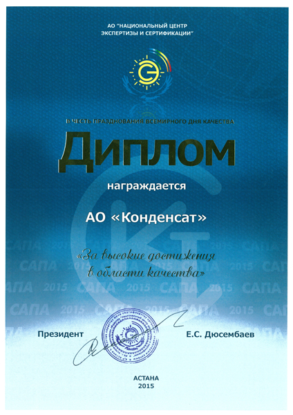 Деятельность АО «Конденсат» в очередной раз отмечена дипломами АО «Национальный центр экспертизы и сертификации».