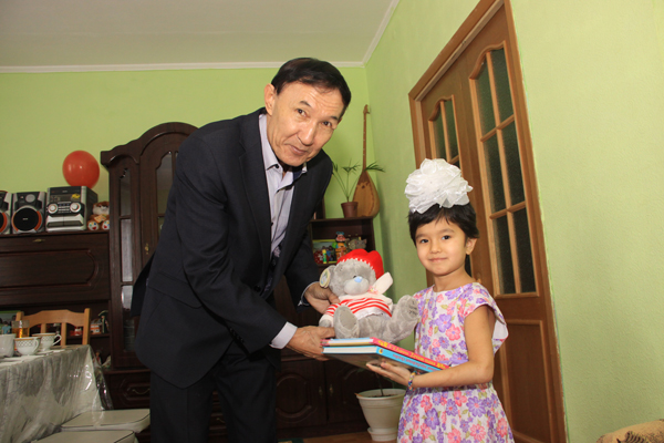 Девочка учится в первом классе, и очень обрадовалась подарку – большим, прекрасно иллюстрированным книжкам «Лучшие сказки» Андерсена и «Волшебные зарубежные сказки», и мягкой игрушке мишка Тедди. По вкусу имениннице пришлись и фрукты со сладостями, привезенные шефами. Поскольку это было первое знакомство с друзьями из «Конденсата», то впечатлений у Казимы было море. Она чинно пожала каждому руку, гордо подняв свой бант-корону. Не отставал от сестры и шестилетний Алмазбек. Он с большим любопытством встречал гостей, рассматривал подарки и с удовольствием позировал.