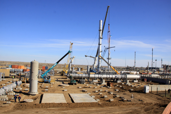 Большая часть фундаментных блоков была изготовлена на местном предприятии и, по словам директора проекта Александра МАЮЧЕГО, выполнена с высоким качеством. Крупные фундаменты под технологические колонны и компрессоры изготавливались на месте также с соблюдением всех технологических требований. В течение этой недели планируется завершить монтаж всех семи технологических колонн и двух компрессоров по 60 тонн каждый. Строительно-монтажные работы ведет ТОО «Роснефтекомплект-Казахстан».