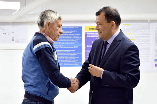Продолжением юбилейных торжеств стал визит главы района в центр развития персонала «Конденсат» для вручения наград работникам предприятия в качестве признания заслуг коллектива. Медалью «Городу Аксаю 50 лет» награждены генеральный директор АО «Конденсат» Нурия МУФТЕЕВА, операторы технологических установок Жеткен САРСЕНОВ и Максот ЖАНДАЛИЕВ, водитель Иван КОЗЛОВ, а также нынешние пенсионеры Гарипулла ЕРГАЛИЕВ, проработавший в компании 18 лет оператором газовой котельной, и Сабит САРСЕНОВ, в прошлом электрослесарь. Все награжденные – ветераны АО «Конденсат».