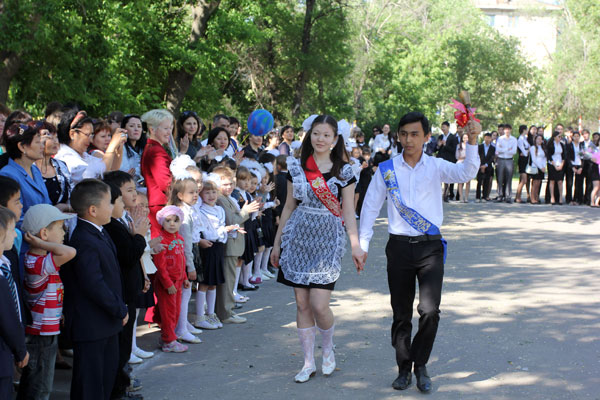 Но вот звучат фанфары, под музыку и аплодисменты присутствующих из дверей школы выходят выпускники 2013 года. Девушки – в школьных платьицах, белых фартучках и с большими бантами в прическах, ребята – в белых рубашках и строгих костюмах с галстуками. В СОШ № 40, где от ГКК присутствовали руководитель аппарата Совета директоров ГКК, депутат гормаслихата Дина Галиметденова и директор фонда «Конденсат-Келешек» Беккет БАЛЫКОВ, выпускники держали в руках голубей, которых выпустили в небо по сигналу своего классного руководителя. Это было очень символично – птицы долго кружили над школьным двором, а потом разлетелись в разные стороны.