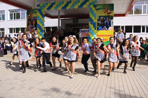 В числе почетных гостей на торжественной линейке в СОШ №7 присутствовал член совета директоров АО «Конденсат», депутат областного маслихата Фарид БАХТИОЗИН, который многие годы оказывает большую моральную и материальную поддержку и учителям, и школьникам. Благодаря его активному содействию в 2014 году эта школа была капитально отремонтирована. Также на праздник к выпускникам пришли бывшие директора школы ветеран педагогического труда Борис ЧЕБАКОВ и Заслуженный учитель КазССР Василий БАЕВ. По словам директора Виктора ПРОТАСОВА, выпускники 2016 года (94 из 1737 учащихся окончили 11 класс) успешно выступали на олимпиадах и интеллектуальных соревнованиях от городского до международного уровня. Выпускница Бекзад ЖАНБУЛАТОВА уже получила сертификат в 125 баллов и грант на обучение, как победитель международного конкурса научных проектов. Гвоздем программы праздника в этой школе можно смело назвать маски-шоу: выпускники исполнили зажигательный ультрасовременный микс, надев маски-лица учителей. Самым крутым танцором, разумеется, был «директор» Алим БУРЕКЕШЕВ.