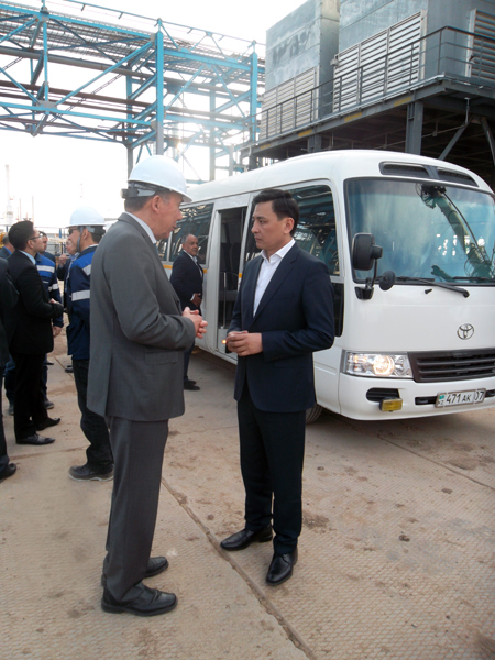 Руководство компании в лице председателя Совета директоров В.К.Джунусова, генерального директора Э.В.Джунусова, директора строительства А.Ф.Маючего ознакомили акима с сутью и целью проекта : «Строительство 2-ой очереди малотоннажного завода для производства моторных топлив экологического класса К5» и показали объекты завершающейся стадии строительно-монтажных работ, а также участки, на которых начаты пуско-наладочные работы.