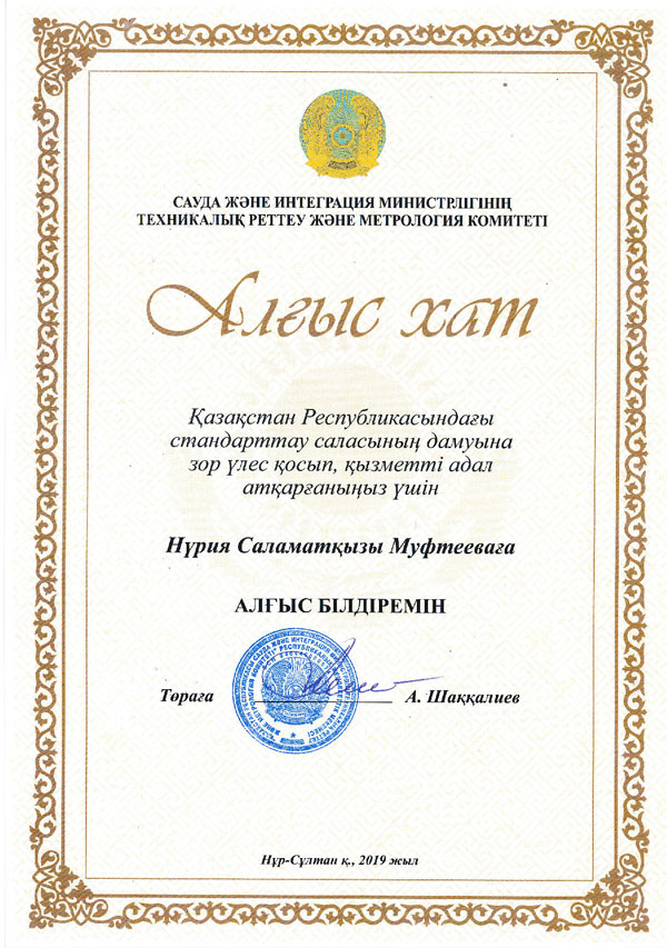 АО «Конденсат» награждено за вклад в системное развитие стандартизации Благодарственным письмом от Комитета технического регулирования и метрологии Министерства торговли и интеграции РК.