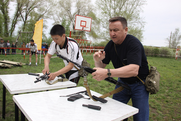 Итак, в военно-спортивной эстафете приняли участие восемь команд по шесть человек в каждой. В ходе соревнований участники производили неполную разборку и сборку автомата АК-74. Затем следовало в противогазе преодолеть по-пластунски препятствия из «колючей» проволоки, пробежать 20 метров, метнуть с колена учебную гранату в «танк», пробежать ещё 20 метров и передать эстафету, - здесь требовались выносливость, ловкость и воля к победе. Продолжалась эстафета бегом на короткие дистанции, подтягиванием на турнике, стрельбой из пневматической винтовки, прохождением лабиринта, горизонтальной лестницы и бревна. Ну, а под занавес «медсестра» оказывала первую доврачебную помощь «раненому», которого транспортировали на носилках к финишу. Победители определялись по наименьшей сумме затраченного командой времени. Лидер обогнал аутсайдера меньше, чем на две минуты: 5 мин 6 сек и 3 мин 15 сек. Согласитесь, неплохая подготовка у команд.