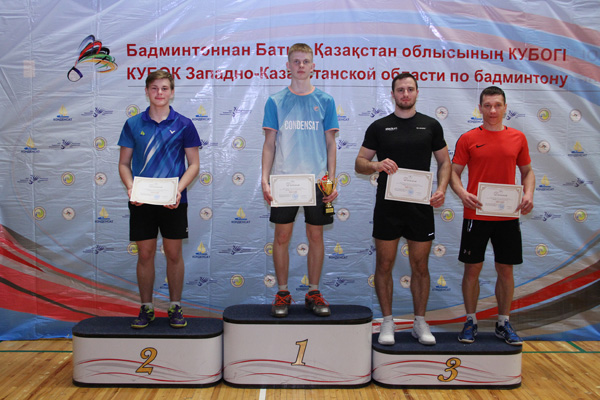 В одиночном мужском разряде блеснули техникой и физической подготовкой юные спортсмены, учащиеся СОШ №13 и областной детско-юношеской спортивной школы ракеточных видов спорта Андрей Шалагин и Никита Васильев, которым, соответственно, 17 и 15 лет. Несмотря на юный возраст, эти спортсмены сегодня являются лидерами в области, и на турнирах регулярно завоевывают ведущие места. И на этот раз, встретившись в финале, они показали красивую игру. Победа досталась более старшему и опытному Андрею Шалагину, победившему оппонента со счетом 2:0. Тренируют ребят мастер спорта Республики Беларусь Андрей Клемец и старший тренер ЗКО Наталья Совена. Третье место разделили также опытные спортсмены, имеющие хорошую физическую подготовку и игровые навыки, тренеры фитнес-центра «Энергия» Дмитрий Рублев и Ренат Валеев.