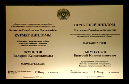 In the last month of 2008 the Condensate Group of Companies was awarded with an Honorary Diploma of the President of the Republic of Kazakhstan N.A.Nazarbayev.